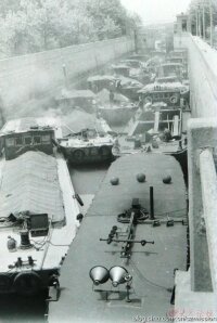 (九) 自泇河开通以来,韩庄运河就有了闸。明万历年间,运河(古泇河)上就设有台儿庄、侯迁、顿庄、丁庙、万年、张庄、六里石、德胜庄8道闸,俗称“泇河八闸”。 山东省计划委员会于1965年9月编制了《韩庄运河复航工程设计任务书》,并上报国家有关部门。1967年底,国家计划委员会批复同意韩庄运河复航工程建设。1968年初,组建枣庄地区伊运河复航工程指挥部。1972年4月,韩庄船闸、刘庄和台儿庄两处通航枢纽全部竣工(见上文)。停航几十年的鲁苏航线由此再次打开。1989年 ,经国家计划委员会和交通部批准,在韩庄运河(台儿庄一大王庙)航道开挖工程建设的同时,于台儿庄闸南韩庄运河右岸大堤内侧的滩地上又新开一条越河,并建二级标准船闸一座,1995年投入使用。1996年底,韩庄运河扩大工程开始全面动工。1999年12月,韩庄运河中游的万年闸枢纽工程宣告竣工。 至此,枣庄市境内的韩庄运河航道和伊家河航道便有了三大通航枢纽(枢纽,船闸、节制闸和公路桥、堤防、河道、引航道等综合工程)。台儿庄、万年闸已经成为镶嵌在韩庄运河上两颗璀璨的明珠,其软硬件建设、人文气息、管理水平、服务能力已经成为京杭大运河上屈指可数的亮点船闸,其服务产品已经成功通过ISO9001质量管理体系认证和ISO14001环境管理体系认证。 (1.)刘庄枢纽(略) (2.)台儿庄枢纽 台儿庄枢纽工程包括台儿庄船闸、台儿庄节制闸和后来建成的台儿庄二线船闸以及与节制闸附建一处的公路桥。该通航枢纽坐落于韩庄运河的下游,上距万年闸枢纽18.5公里,闸下6.5公里航道在市境内,再东入邳境的中运河。台儿庄枢纽工程国家先后总投资6600余万元。 台儿庄老船闸1970年3月动工兴建,1972年4月竣工。同年5月1日经省市有关部门验收鉴定交付使用。该闸为五级标准通航船闸,由上闸首、闸室、下闸首三部分组成,钢筋混凝土石砌混合结构。闸室总长120米,宽12米;上下闸门宽 10米,钢质结构,为人字形分为两扇,由电动启闭机控制;闸下拦水深度为2.2米。可通过100吨级驳船。台儿庄节制闸(见上文) 15. 台儿庄二线船闸坐落在韩庄运河下游右岸大堤的内侧,与台儿庄船闸隔河相望。1989年12月开工建设,1995年6月全部竣工。国家和地方总投资6300万元,其中国家投资4049万元。 根据国家对京杭运河的总体规划要求,韩庄运河上的永久建筑物须按二级航道标准兴建,航道可暂按三级航道标准开挖。故台儿庄二线船闸按二级航道标准建设,设计单向通过能力为2100万吨,可通航4000吨、2000吨顶推船队以及拖带船队。 (3.)万年闸枢纽 万年闸枢纽工程包括万年闸船闸、万年闸节制闸和一座长922.5米与节制闸连体的公路桥。该枢纽坐落在韩庄运河中游,上距微山县境的韩庄枢纽18公里,下至台儿庄枢纽18.5公里。万年闸枢纽工程建设,国家先后投资1.84亿元。 16. 万年闸船闸于1996年4月动工兴建,1999年12月竣工。国家和地方投资10202万元。长 230米,门槛水深5米。该船闸为二级标准船闸,设计单向通过能力为2600万吨。可通航2X2000吨,2X1000吨顶推船队以及拖带船队。 17. 万年闸节制闸1996年开工建设,1997年经山东省交通厅 质量监督站验收鉴定交付使用,国家总投资为2652.59 万元。万年闸节制闸总计10 孔,每孔宽 10米,总宽为115.89 米。闸门由卷扬式启闭机控制。万年闸节制闸的主要用途是控制水位,保证通航。同时,便于上游沿岸提水灌溉农田。(未完待续)